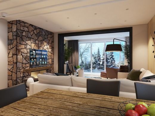 ВернутьсяВ дизайне интерьера загородного дома дерево и камень – всегда желанные гости. Теплая, податливая древесина идеально сочетается с прохладным, твердым камнем. Эти материалы дополняют друг друга, с их помощью можно оформить любое помещение в доме – гостиную, спальню, детскую и даже ванную.
