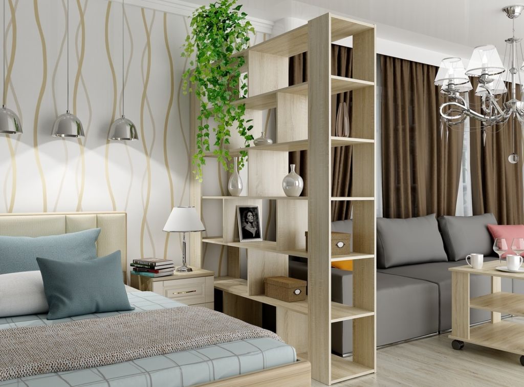 Для небольшой комнаты в качестве перегородки лучше использовать стеллаж без задней стенки – эта конструкция не утяжелит пространство и позволит сохранить нормальный уровень освещения.