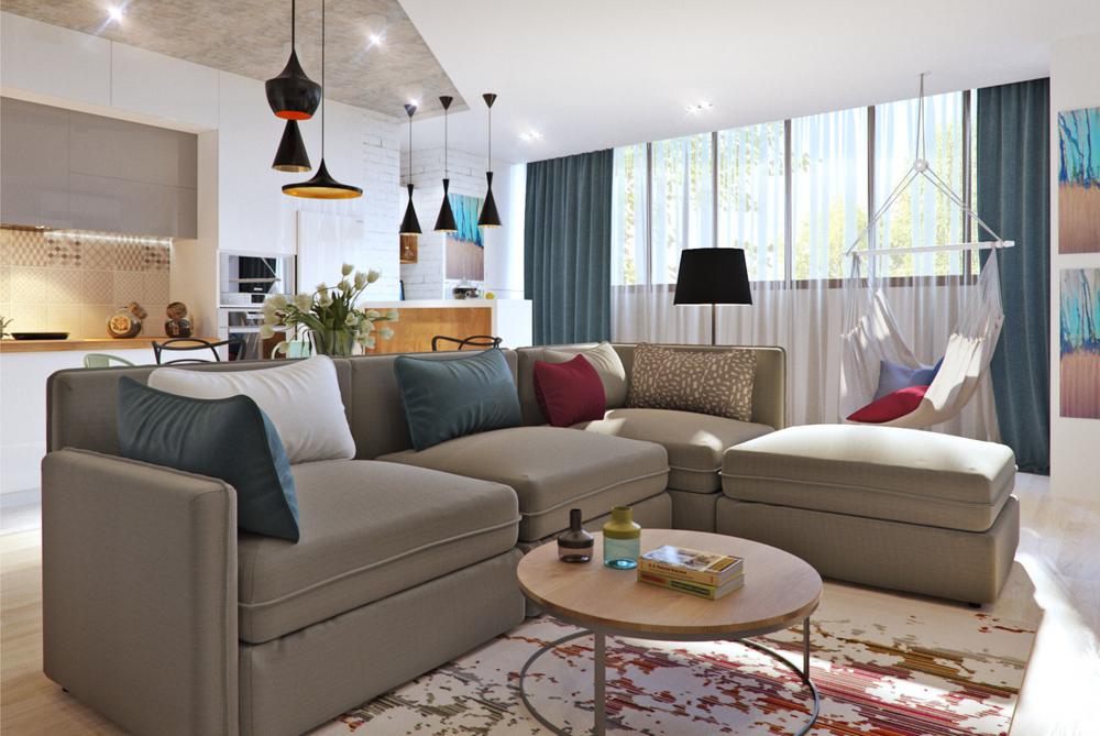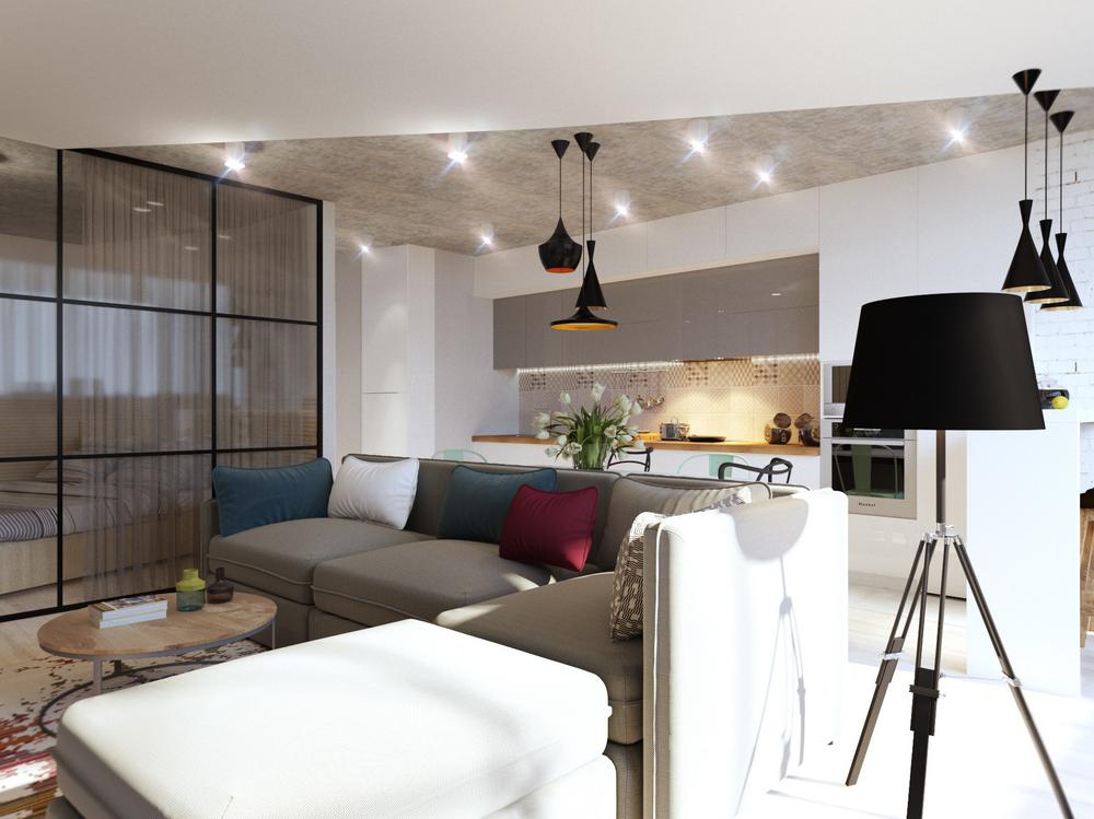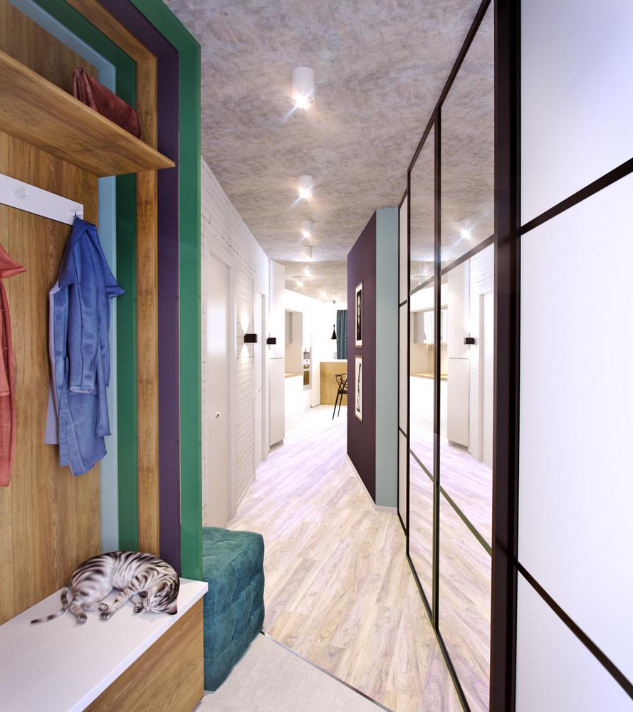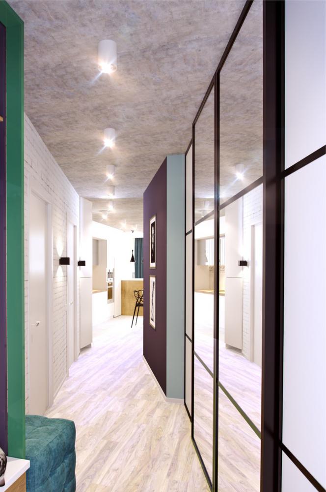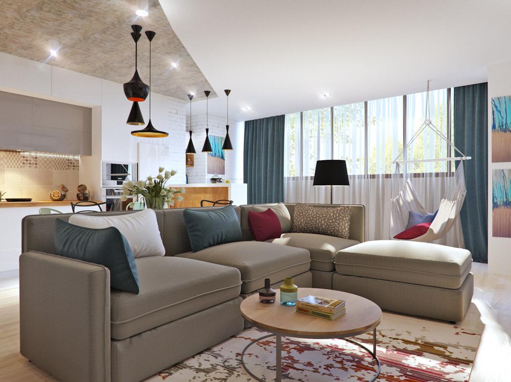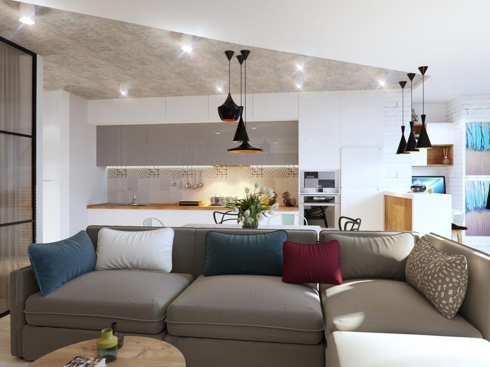 Дизайн квартиры разрабатывался для современной и активной семейной пары. Каждый квадратный метр мы старались использовать с пользой, при этой сохранив общее ощущение воздуха и пространства. Объединив кухню с гостиной, мы получили зону, где вечером найдется место для всех друзей и родственников. А еще отдельное, для маленького жильца квартиры – любимого шпица. Главным пожеланием заказчиков был «капсульный» дизайн – нейтральный стены и пол и при этом яркие акцента в текстиле и мебели. Последние можно заменить на другие цвета, получив совершенно иной по настроению интерьер.