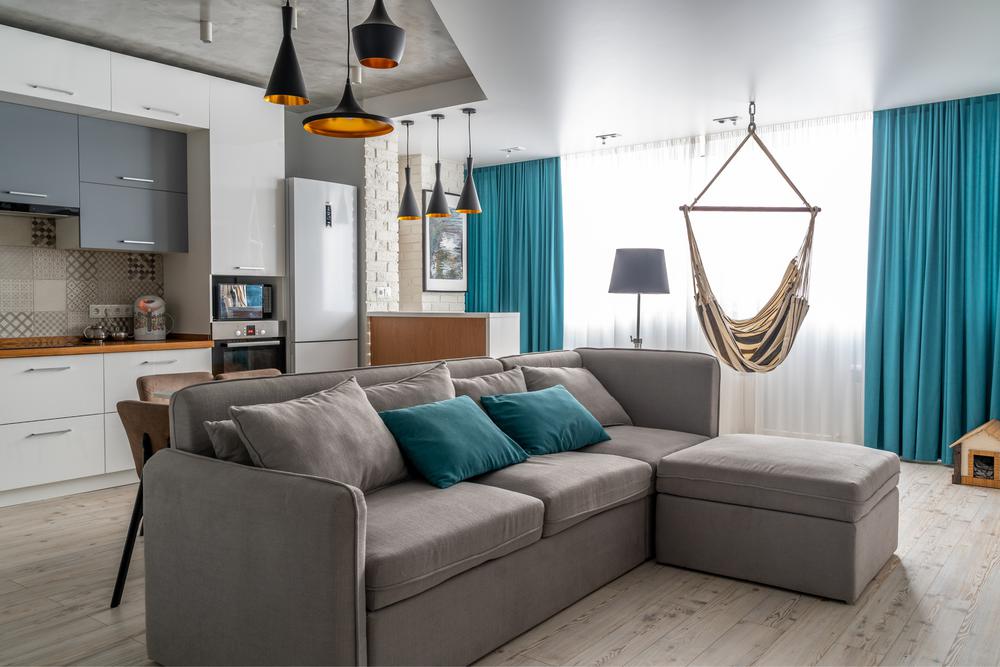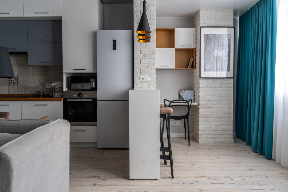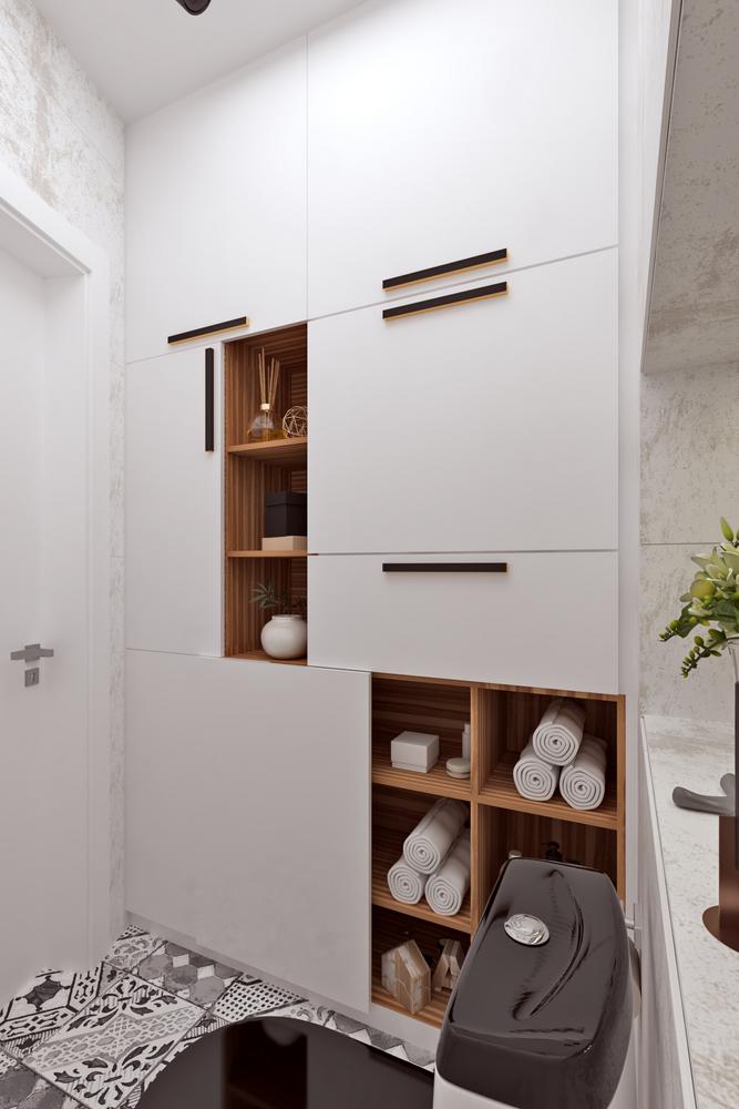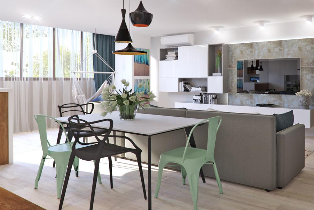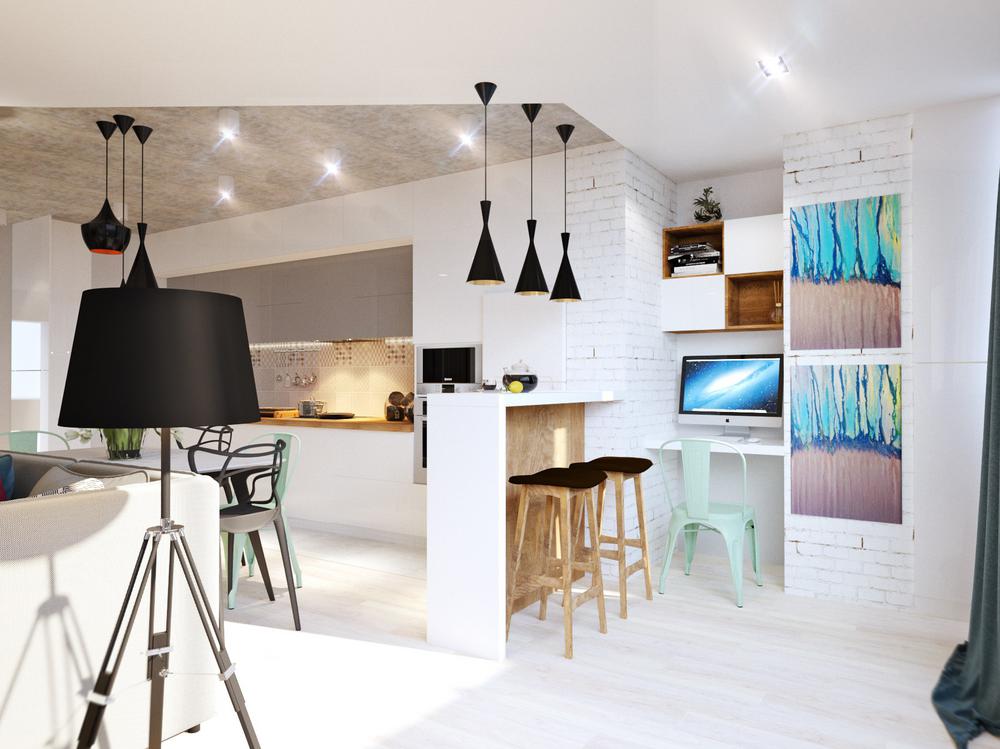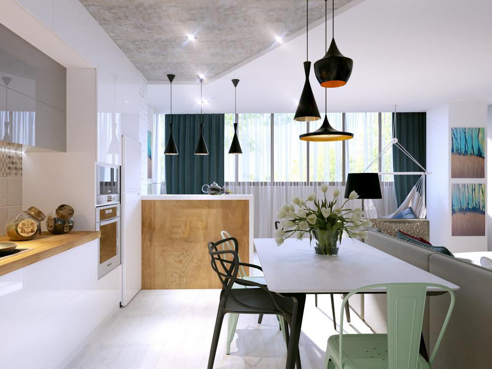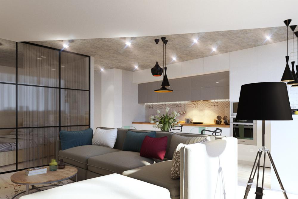 Дизайн квартиры разрабатывался для современной и активной семейной пары. Каждый квадратный метр мы старались использовать с пользой, при этой сохранив общее ощущение воздуха и пространства. Объединив кухню с гостиной, мы получили зону, где вечером найдется место для всех друзей и родственников. А еще отдельное, для маленького жильца квартиры – любимого шпица. Главным пожеланием заказчиков был «капсульный» дизайн – нейтральный стены и пол и при этом яркие акцента в текстиле и мебели. Последние можно заменить на другие цвета, получив совершенно иной по настроению интерьер.