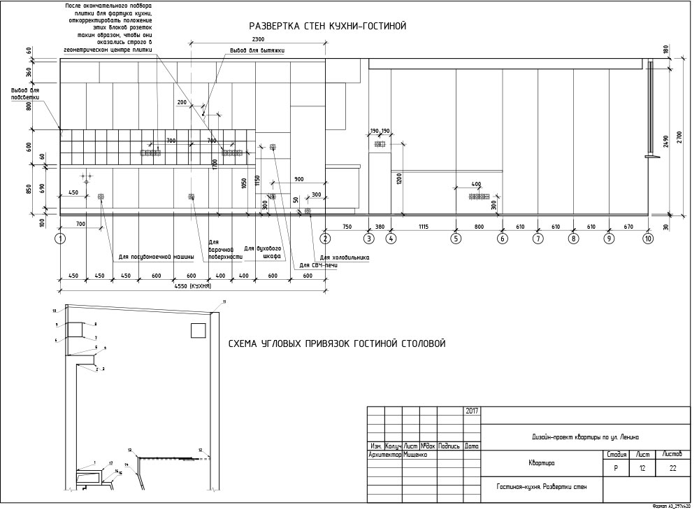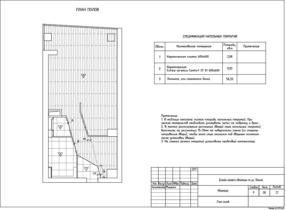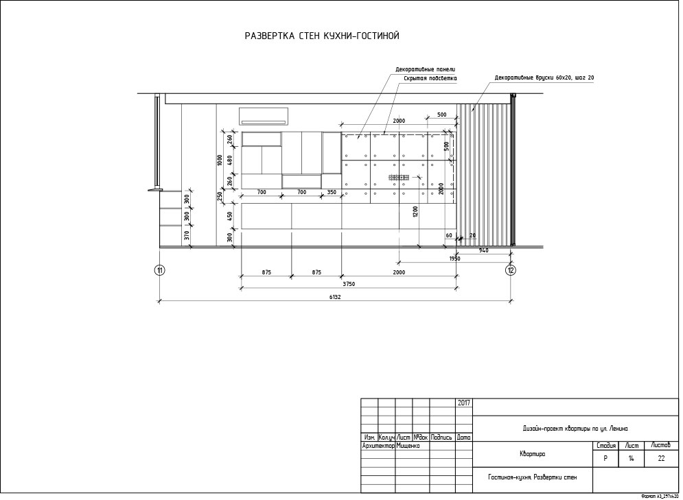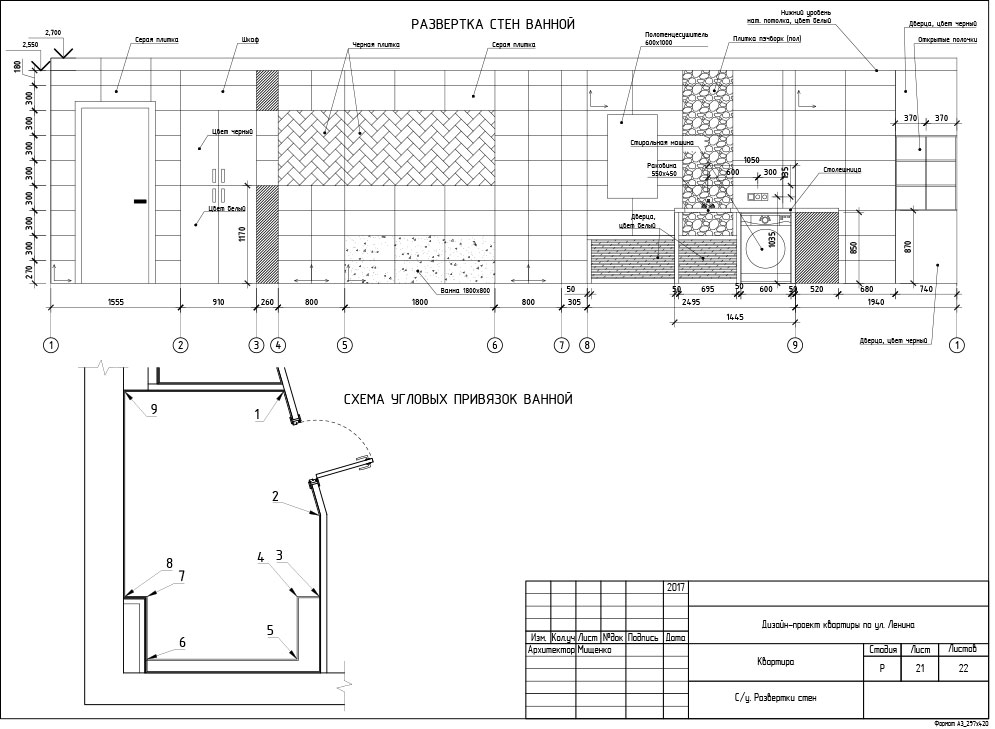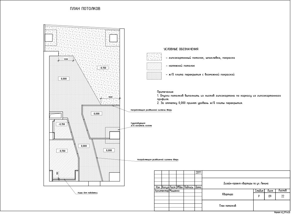 Итак, визуализации всех помещений полностью согласованы, материалы подобраны и теперь дизайнер приступает к разработке рабочей документации. Рабочие чертежи необходимы для того, чтобы строительная бригада воплотила ваш интерьер в жизнь в точности как на картинке. На этом этапе мы досконально прорабатываем все технические моменты, указываем расположение и количество розеток, вычерчиваем сложные узлы потолочных конструкций, собираем финальные ведомости по материалам, подсчитываем необходимое количество плитки и многое другое. Состав рабочей документации зависит от выбранного пакета услуг.